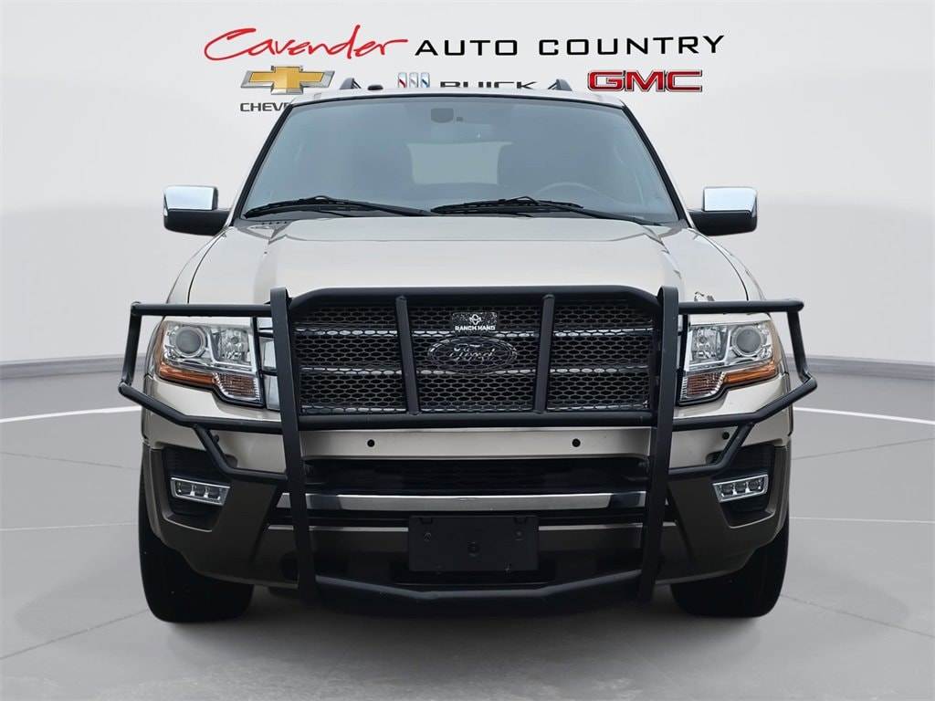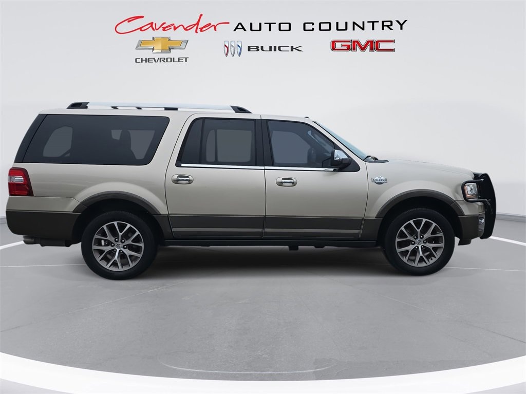 Welcome to Cavender Auto Country Chevy Buick GMC, a Cavender Auto Family dealership. This vehicle is located at 1700 IH-10 East, Weimar, TX 78962. Here at Cavender we build relationships based on trust and integrity to exceed your expectations in your ownership experience. Quite simply, we strive to Make Confidence Happen! So stop by and allow us to serve your automotive needs; we would love to meet you.White Gold 2017 Ford Expedition EL King Ranch RWD EcoBoost 3.5L V6 GTDi DOHC 24V Twin Turbocharged 6-Speed AutomaticFeatures: Equipment Group 401A (Power-Deployable Running Boards and Voice-Activated Touch-Screen Navigation System), GVWR: 7,500 lbs Payload Package, 2nd Row Bucket Seats, 3.31 Axle Ratio, 3rd row seats: split-bench, 4-Wheel Disc Brakes, ABS brakes, Adjustable pedals, Air Conditioning, Alloy wheels, AM/FM radio: SiriusXM, Auto-dimming Rear-View mirror, Automatic temperature control, Brake assist, Bumpers: body-color, CD player, Compass, Delay-off headlights, Driver door bin, Driver vanity mirror, Dual front impact airbags, Dual front side impact airbags, Electronic Stability Control, Emergency communication system: 911 Assist, Exterior Parking Camera Rear, Four wheel independent suspension, Front anti-roll bar, Front Bucket Seats, Front Center Armrest, Front fog lights, Front reading lights, Fully automatic headlights, Garage door transmitter, Heated door mirrors, Illuminated entry, Leather steering wheel, Low tire pressure warning, Occupant sensing airbag, Outside temperature display, Overhead airbag, Overhead console, Panic alarm, Passenger door bin, Passenger vanity mirror, Power door mirrors, Power driver seat, Power Liftgate, Power Moonroof, Power steering, Power windows, Radio data system, Rear air conditioning, Rear anti-roll bar, Rear audio controls, Rear reading lights, Rear window defroster, Rear window wiper, Remote keyless entry, Roof rack, Security system, SiriusXM Satellite Radio, Speed control, Speed-sensing steering, Speed-Sensitive Wipers, Split folding rear seat, Steering wheel mounted audio controls, SYNC 3 Communications & Entertainment System, Tachometer, Telescoping steering wheel, Tilt steering wheel, Traction control, Trip computer, Variably intermittent wipers, and Voltmeter.
