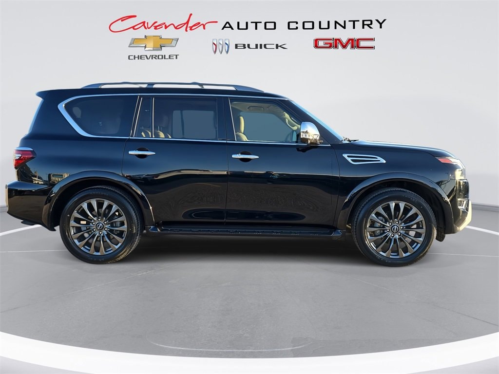 Features: 13 Speakers, 2.937 Axle Ratio, 3rd row seats: split-bench, 4-Wheel Disc Brakes, ABS brakes, Air Conditioning, Alloy wheels, AM/FM radio: SiriusXM, Anti-whiplash front head restraints, Auto High-beam Headlights, Auto tilt-away steering wheel, Auto-dimming door mirrors, Auto-dimming Rear-View mirror, Auto-leveling suspension, Automatic temperature control, Brake assist, Bumpers: body-color, Climate-Controlled Front Bucket Seats, Delay-off headlights, Driver door bin, Driver vanity mirror, Dual front impact airbags, Dual front side impact airbags, Electronic Stability Control, Emergency communication system: NissanConnect Services, Exterior Parking Camera Rear, Four wheel independent suspension, Front anti-roll bar, Front Bucket Seats, Front Center Armrest, Front dual zone A/C, Front fog lights, Front reading lights, Fully automatic headlights, Garage door transmitter: HomeLink, Heated door mirrors, Heated front seats, Heated rear seats, Heated steering wheel, HVAC memory, Illuminated entry, Knee airbag, Leather Shift Knob, Leather steering wheel, Low tire pressure warning, Memory seat, Navigation System, Occupant sensing airbag, Outside temperature display, Overhead airbag, Overhead console, Panic alarm, Passenger door bin, Passenger vanity mirror, Power door mirrors, Power driver seat, Power Liftgate, Power moonroof, Power passenger seat, Power steering, Power windows, Quilted Leather Seat Trim, Radio: NissanConnect w/SiriusXM, Rain sensing wipers, Rear air conditioning, Rear anti-roll bar, Rear reading lights, Rear seat center armrest, Rear window defroster, Rear window wiper, Reclining 3rd row seat, Remote keyless entry, Security system, Speed control, Speed-sensing steering, Speed-Sensitive Wipers, Split folding rear seat, Spoiler, Steering wheel memory, Steering wheel mounted audio controls, Tachometer, Telescoping steering wheel, Tilt steering wheel, Traction control, Trip computer, Turn signal indicator mirrors, Variably intermittent wipers, Ventilated front seats, Voltmeter, and Wheels: 22 x 8J Machine-Faced w/Tinted Clear Coat.